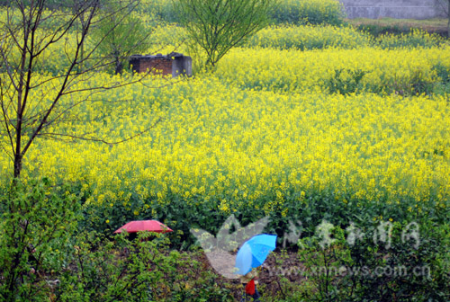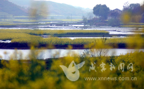 清明節前夕,春雨淅淅瀝瀝,咸安區官埠橋鎮油菜基地一片江南水鄉景色,和風細雨讓金色的田野充滿靜謐之美,幕色里,雨霧中,水靜扶花幽,花香聊人醉。(記者 大樂 攝)