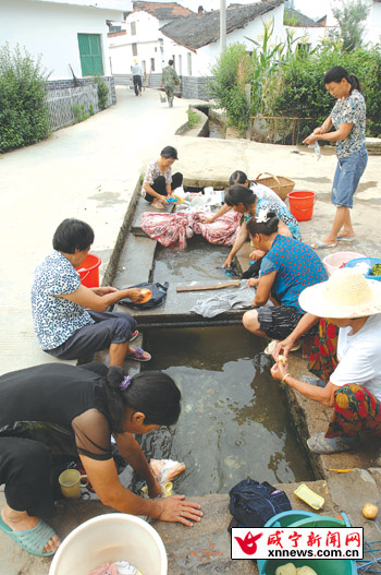 順著已建好的街道往前走百余米,傳來(lái)陣陣婦女的笑聲。原來(lái),幾位村婦正圍在一個(gè)水池旁洗衣洗菜。“這里的水很干凈,全部是地下水,冬暖夏涼的。水池就在家門(mén)前,很方便!”一位正在池邊洗菜的阮姓村民笑著說(shuō)。