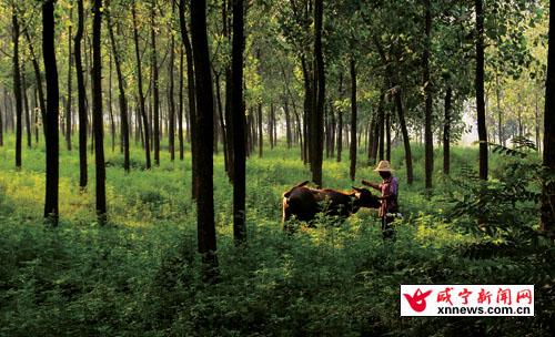 一進(jìn)村,你就被淹沒在了茫茫的綠色里:一株株、一排排意楊拔地而起,林間綠草葳蕤,薄霧輕籠。浩浩十里速生林為洞門口吳家村擋著京廣鐵路、107國道上南來北往車輛的噪聲,也為這個小村莊擋住了漫天的灰塵和城市的喧囂。