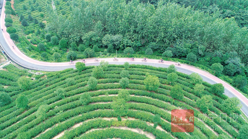 在汀泗橋鎮黃荊塘村,自行車愛好者騎行于茶園中。