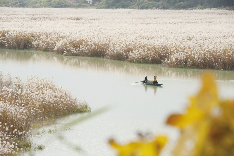 乘船穿梭在通山富水湖濕地公園里茂密的蘆葦蕩中,成片的蘆葦在陽光下舒展著身姿,隨風而動,高挑優雅,如夢似幻。遠遠望去,仿佛看到了麥浪翻滾,又如星河密布,道不盡生態多樣性之美。