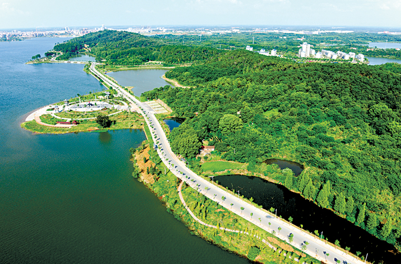 環湖公園由大崇山路景觀帶和牛頭山景觀群構成,東北始于南嘉大道與大崇山路交匯處,西南至白湖橋。環湖公園根據其地理位置及城市景觀規劃,以“詩畫嘉魚,魅力三湖”為設計主題,以現代明快的造景手法,挖掘和弘揚嘉魚文化,打造梅澥湖沿岸景觀,形成現代城市與生態景區的自然過渡,建有雙魚朝圣、南嘉源、詩經三島、文化長廊、南如渡、群賢苑、濯心亭、雄風臺等八處主題景點,主要展示嘉魚起源和詩經文化、魚文化、三國文化,是一處集休閑、文化娛樂、運動健身于一體的綜合性公園。