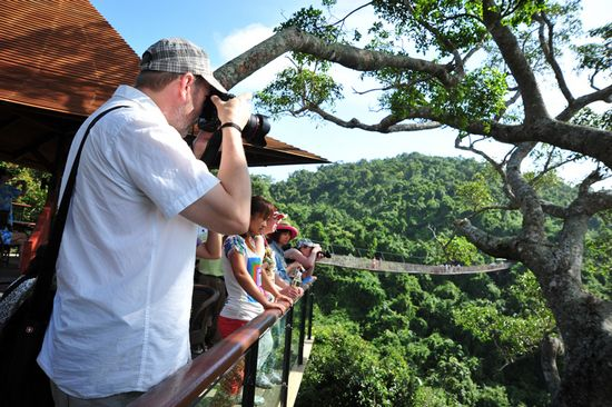 芬蘭攝影師一行被海南三亞的熱帶海岸森林所陶醉,景區中的煙波亭、過江龍索橋、峭壁天池、鳥巢外景等景點被芬蘭攝影師們收入鏡中,芬蘭攝影師們盡情地在景區中進行拍攝創作,亞龍灣熱帶天堂森林旅游區的自然生態和旖旎多彩的美麗風光深受芬蘭客人的青睞。