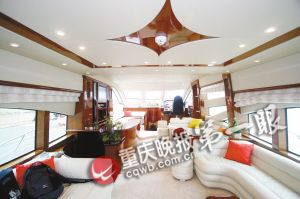 “流線形船身、美麗的陽光甲板、真皮沙發與櫻桃木搭配……”站在柚木地板的船尾,陽光明珠游艇向導介紹,該艇長80英尺(英尺≈0.3米),除寬大的休閑廳外,還有小型影劇院、臥室等,售價高達700多萬元。