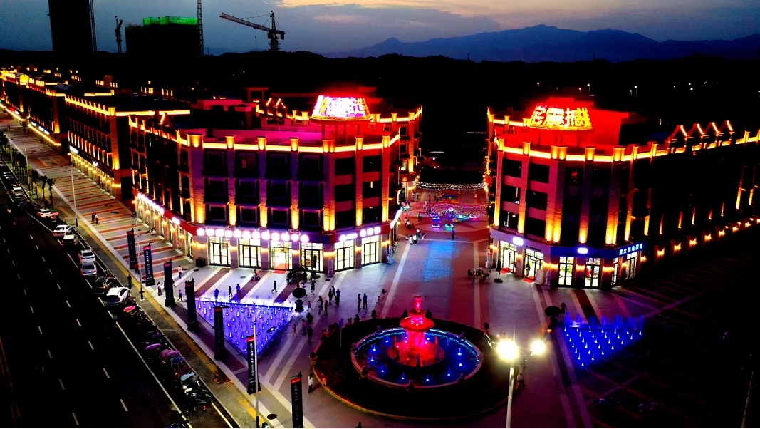 暮色漸深,萬雅國際商貿城廣場前的音樂噴泉準時跳動,在彩燈的照射下,時而紅時而綠,五光十色,十分迷人。