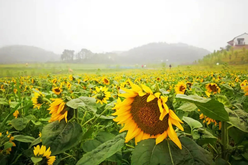 咸安區高橋鎮蘿卜公社里的葵花正迎著太陽陸續盛開。