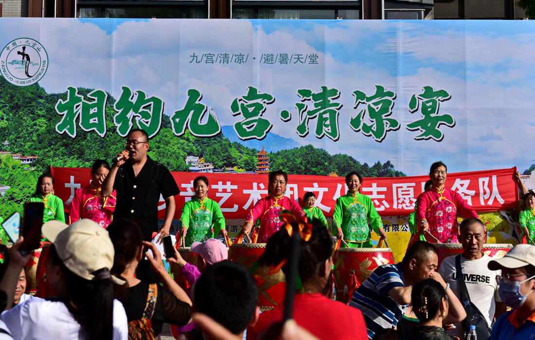 這一系列的演出,旨在為今年九宮山避暑季增添輝煌的色彩,為游客架設(shè)自由發(fā)揮的舞臺(tái)。眾人拾柴火焰高,眾人抬轎好唱戲,九宮鄉(xiāng)音藝術(shù)團(tuán)、琳子舞蹈隊(duì)、同窗同樂樂隊(duì)、黃石青子鼓秀隊(duì)等藝術(shù)團(tuán)隊(duì)登臺(tái)傾情獻(xiàn)藝。特別是黃石青子鼓秀隊(duì),她們一行30余人慕名來到九宮山,本來是開展自由娛樂活動(dòng),得知九宮山有官方主辦的文藝演出,便主動(dòng)聯(lián)系九管局,迫切要求登臺(tái)獻(xiàn)藝,為九宮山避暑季助興。演出當(dāng)天,她們英姿颯爽、滿懷激情地登上寬大的舞臺(tái),盡情地秀了一把,贏得了熱烈的掌聲。