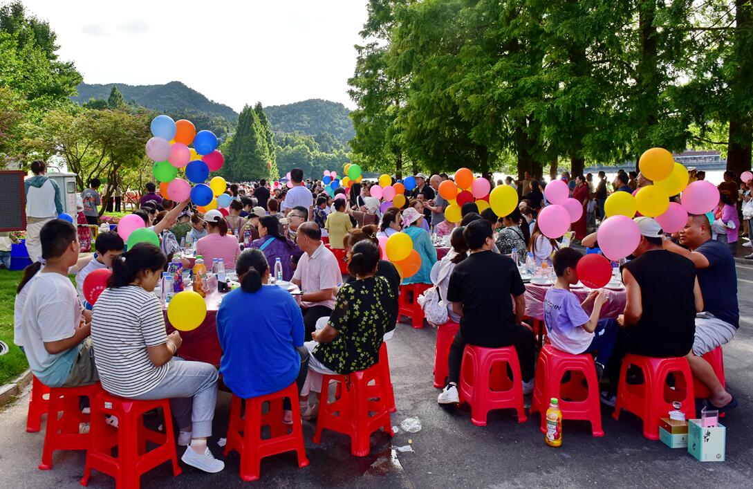 云中湖畔的“清涼宴”,既是美食盛宴,也是歌舞龍場(chǎng),云蒸霞蔚在天邊,美酒佳肴在眼前,游人親人驚相似,熱鬧非凡勝過年。百桌千人,熱浪翻騰,把酒臨風(fēng),云湖照影,斯人盛況,空前望后。喝啤酒大賽,將清涼宴推向高潮,巾幗不讓須眉,氣概豪邁,讓人賞心悅目,一位網(wǎng)名為“小萌萌哦”的美女游客,登臺(tái)參加了啤酒大賽,并獲得了冠軍。九宮鄉(xiāng)音藝術(shù)團(tuán)的嫂子們舉起酒壺不斷敬客人,聲情并茂地演唱“歡迎來到九宮山把酒扯倒喝”,共醉美麗的清涼天。