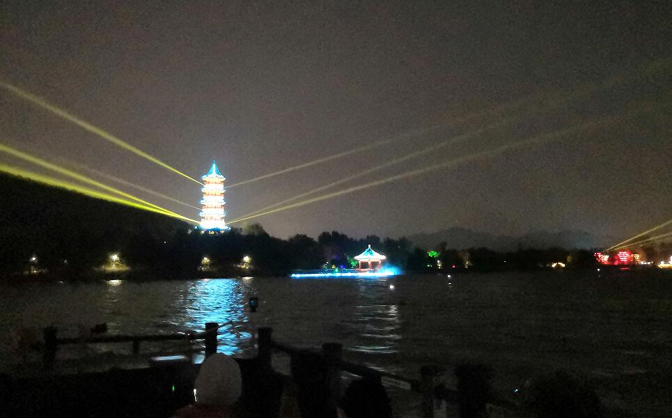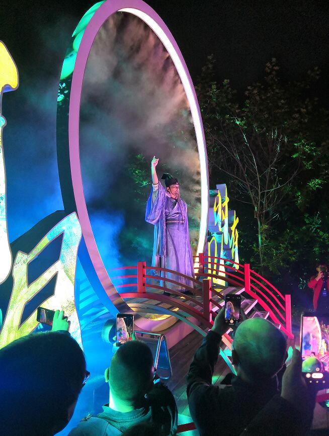演出在現(xiàn)場的燈光秀和鑼鼓聲中拉開了序幕,此時(shí),音樂響起,我們觀眾和穿著千年前宋朝服飾的徐州“士紳百姓”一起,站在城樓前,以其特有的方式迎接知州“蘇東坡”,不愧是大文豪,出場方式果然與眾不同,高聲一曲“明月幾時(shí)有,把酒問青天”從幕后走到了臺(tái)前,如此一番慷慨激昂的就職演說打動(dòng)了現(xiàn)場人士,舞臺(tái)上的演員跳起了歡樂的舞蹈,歡迎“蘇知州”的儀式結(jié)束,演出場地便轉(zhuǎn)換到了云龍湖中。