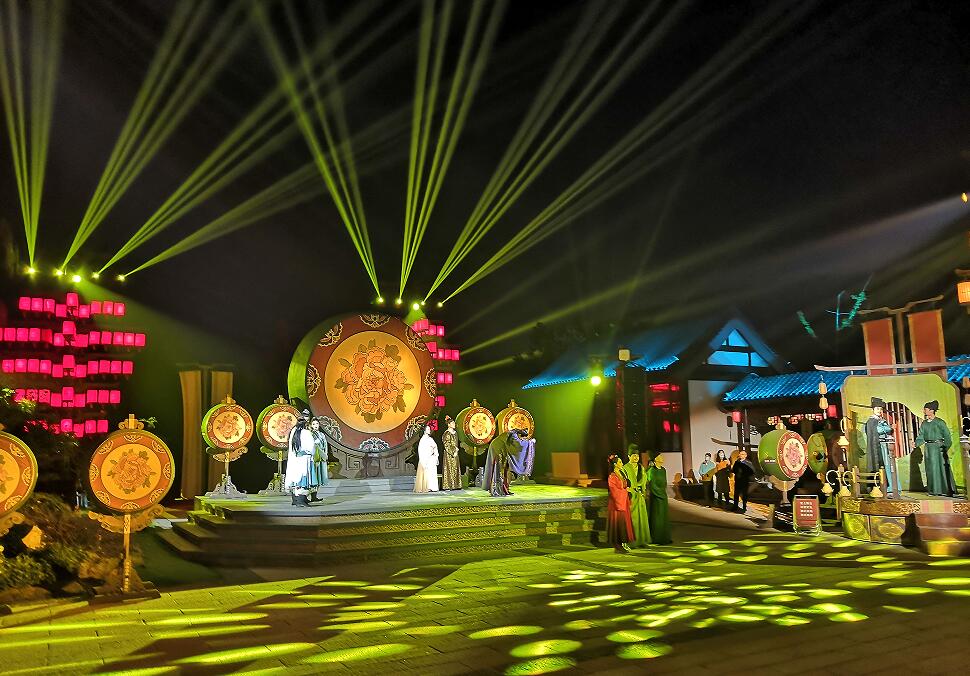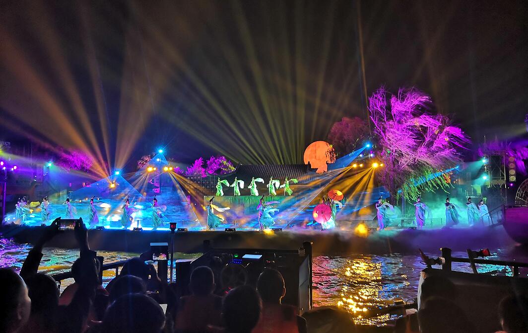 湖風(fēng)變得大了起來,將舞臺(tái)上的旗幟朝一個(gè)方向吹拂,兩邊的青山、欄桿、石橋等參照物,燈光的變幻下有規(guī)律地?fù)u擺,柳堤邊,拱橋上,幾十位少女一字排開,撐著紅傘翩翩起舞,連同舞臺(tái)上載歌載舞的演員一道,既是迎接到任的“蘇知州”,抑或歡迎我們這些來自全國各地的媒體客人。
