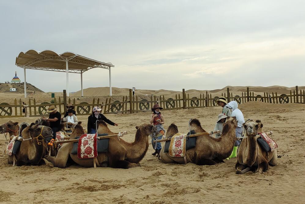 暑期是旅游旺季,來庫布其沙漠游玩的游客較多,騎駱駝是眾多游客必選的熱門游玩項目,從眾的心態讓我在長長的蛇形隊伍后面耐心等待。