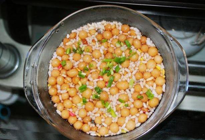 家里如果沒有土炕,可以煤氣灶上架著鐵鍋,待鍋里的菜籽油沸騰翻滾,將曬干的糯米飯粒放入鍋內(nèi),立即撐腰膨脹,形狀如金球。米花炸好,又炸黃豆或花生。