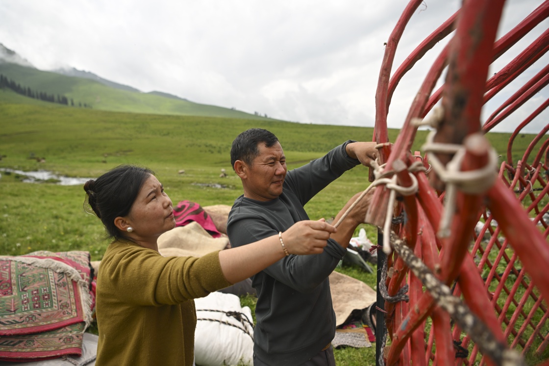 轉場第二天,巴拉提江和妻子在夏牧場上合力搭建氈房(6月11日攝)。