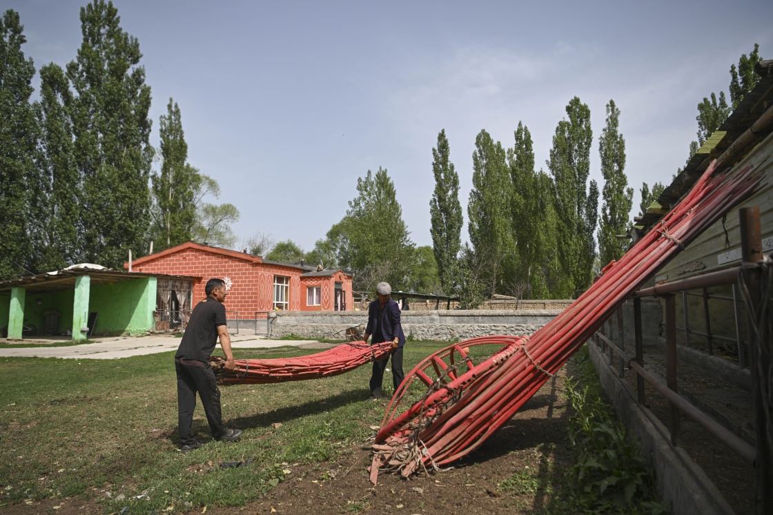 轉場第一天,在新源縣那拉提鎮塔依阿蘇村,巴拉提江(左)和鄰居一起抬著氈房結構部件走在家中小院內(6月10日攝)。