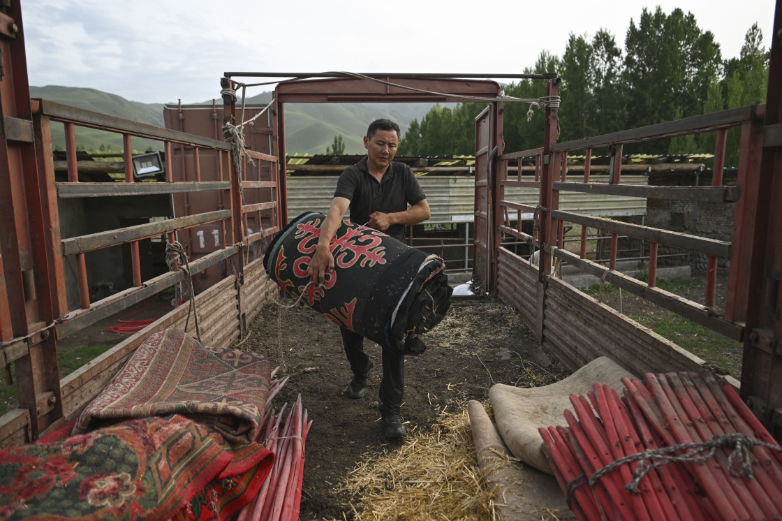 轉場第一天,在新源縣那拉提鎮塔依阿蘇村,巴拉提江在家中小院內把毛毯搬上貨車(6月10日攝)。