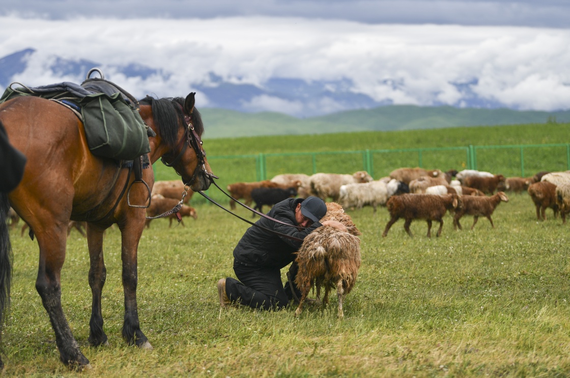 轉場第三天,在前往位于新源縣那拉提草原上夏牧場的路上,巴拉提江下馬檢查一只行動緩慢的羊,判斷身體狀況是否異常(6月12日攝)。