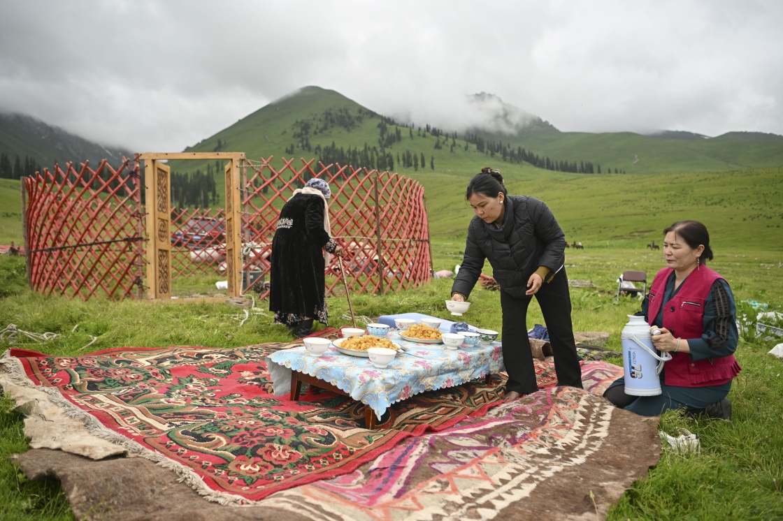 轉場第二天,巴拉提江的妻子(中)、嫂子在夏牧場上為眾人準備午飯(6月11日攝)。
