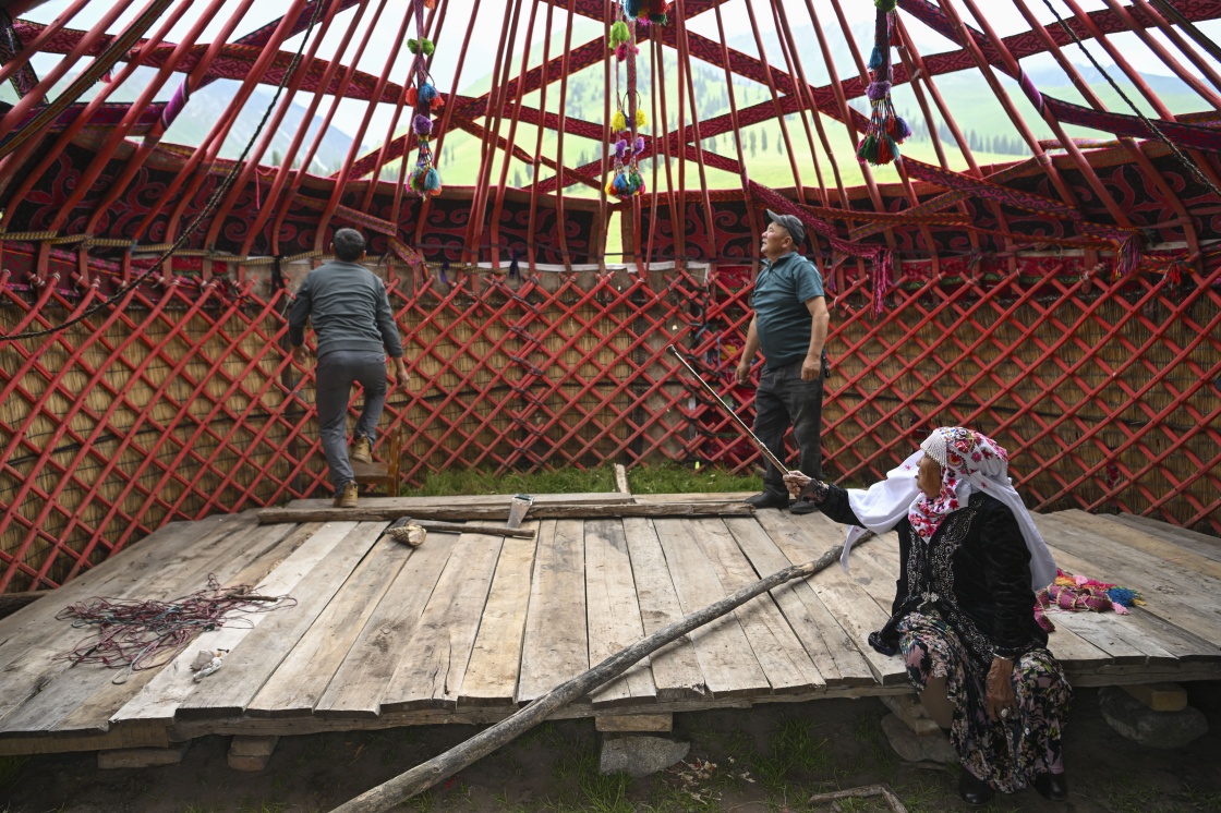 轉場第二天,巴拉提江(左)和哥哥在夏牧場搭建氈房,年近八旬的母親坐在一旁提示兄弟倆布置細節(6月11日攝)。