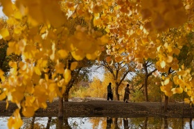 10月14日,游客在甘肅省敦煌市黃渠鎮的胡楊林中游覽。