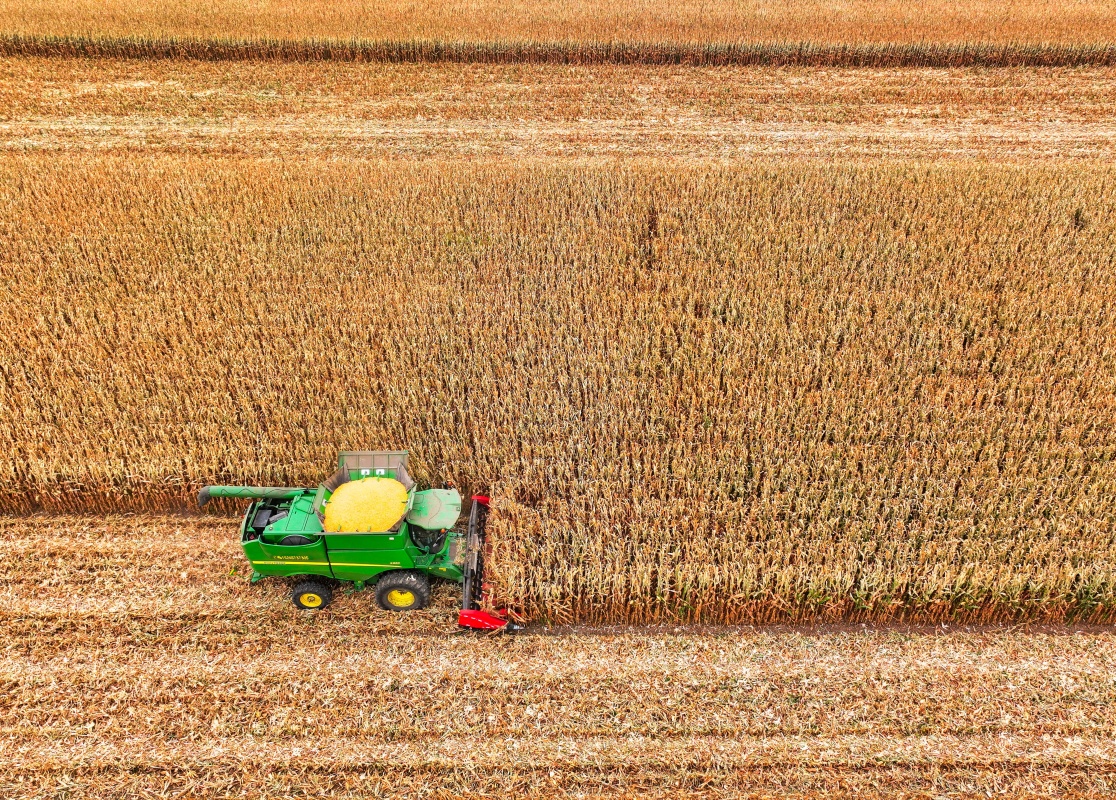 10月14日,在通遼市科爾沁區豐田鎮,農機手駕駛收割機收割玉米(無人機照片)。
