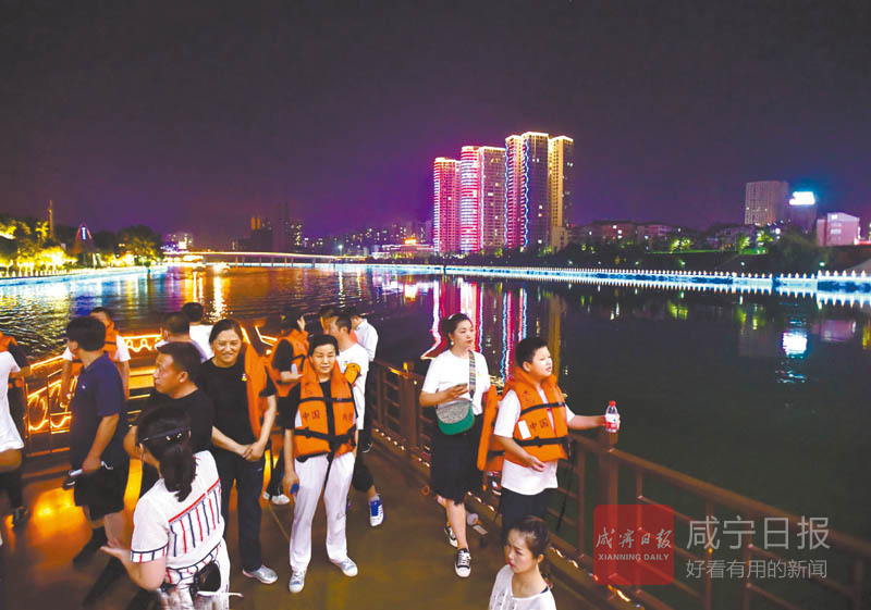 陸水河上,市民在游船上欣賞迷人的赤壁夜景。(圖③)