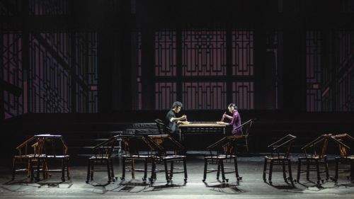 在這些飲食場所,一張竹靠椅、一方矮桌,便成了最顯眼的文化標志。成都的靠椅十分有特色,多以堅韌、清涼的竹子制成,椅背微傾,食客們或躺或坐,放浪形骸,巴適得很。而這一要素被《努力餐》的舞美設計加以利用,將之作為舞美設計上最重要的符號之一。一桌二椅,既可以是桌椅,也不是桌椅,它在觀眾的想象中和創作者的處理中,千變萬化。竹椅和木桌上升到了一個四川符號的高度,竹子制成,清涼巴適,造型獨特,也體現出四川人的那種堅韌清脆的性格特征。在努力餐的舞臺上,觀眾可以看到兩個2米高的竹椅吊在空中,巨大而抽象的竹桌木椅以隱喻形式規定了“餐樓”空間。