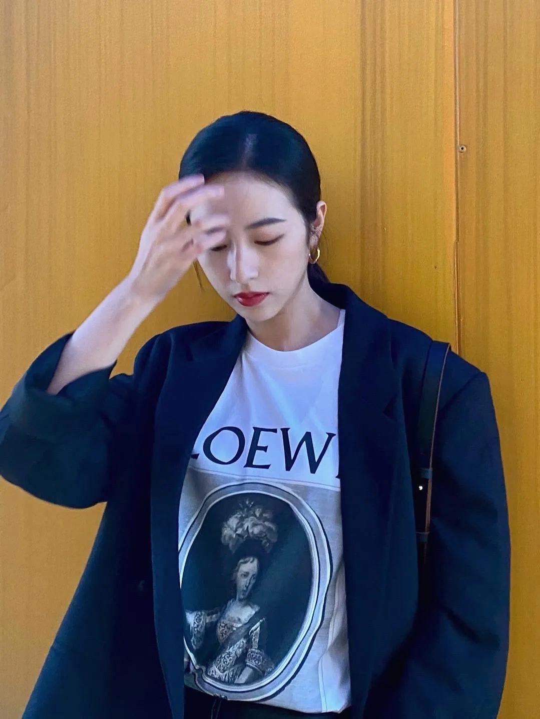周雨彤就用oversized黑西裝內搭LOEWE白T,將袖子挽起。