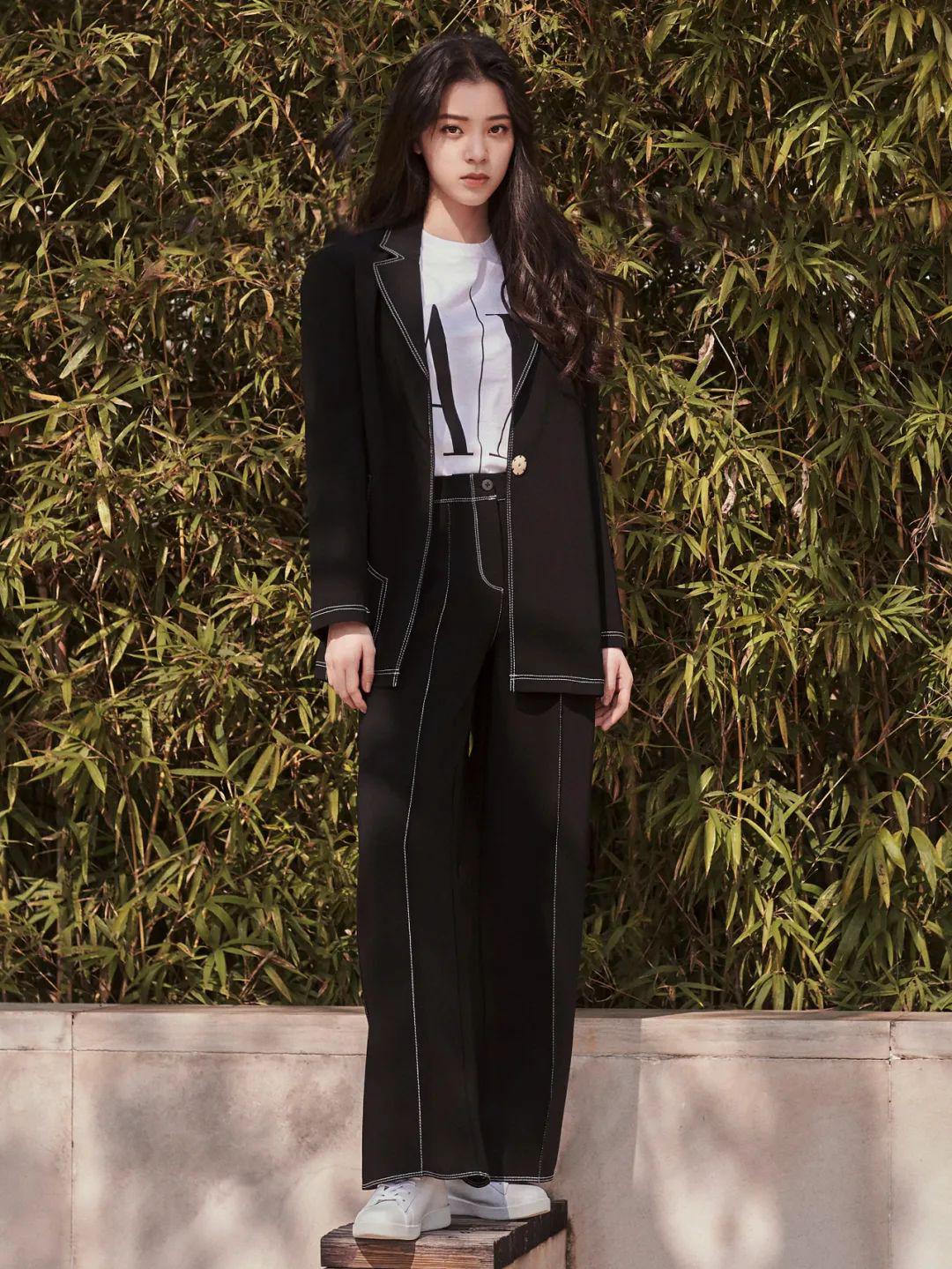 歐陽娜娜也是黑白配,黑色西裝套裝+白T,有一種青春學院風的感覺。