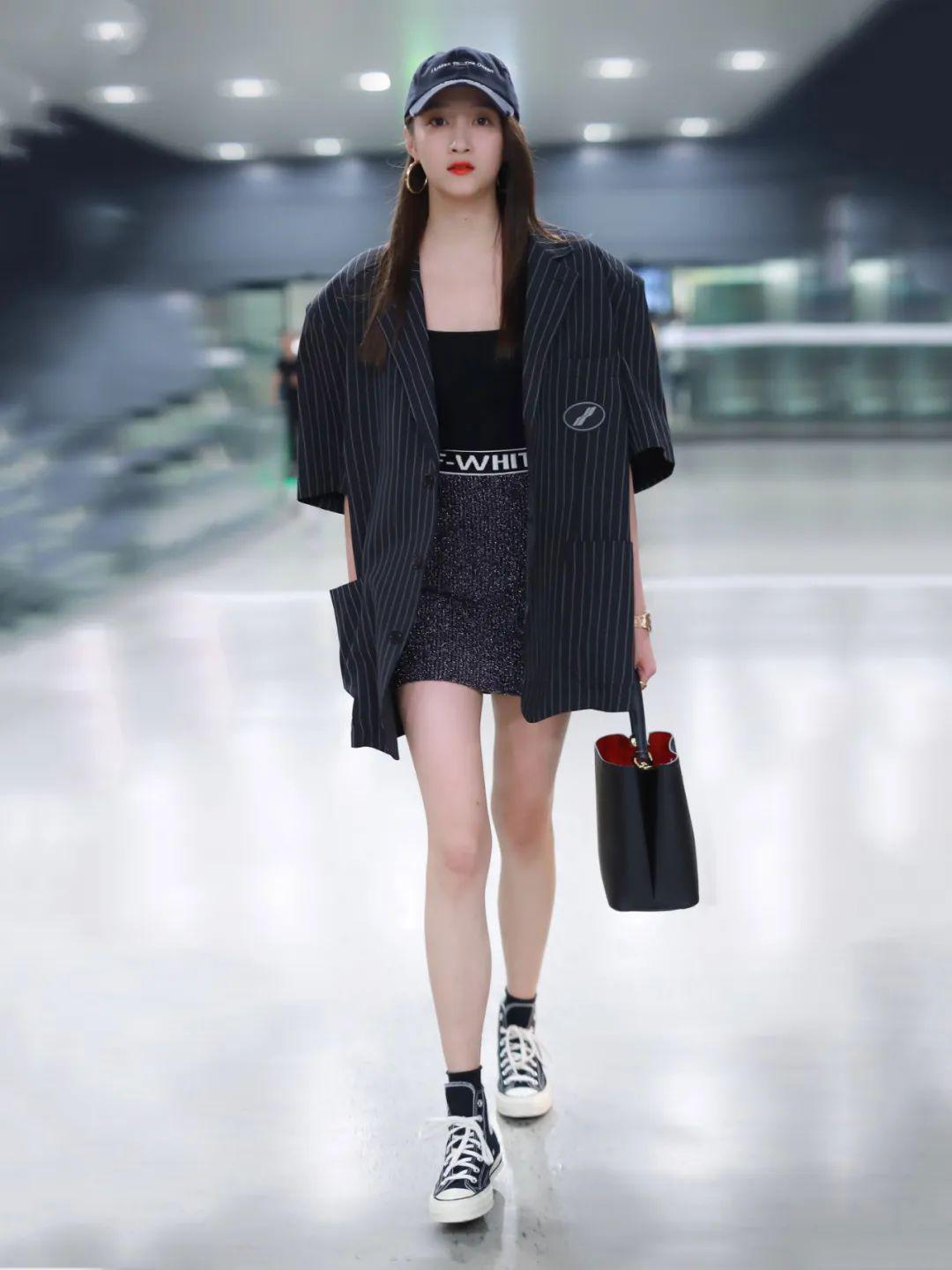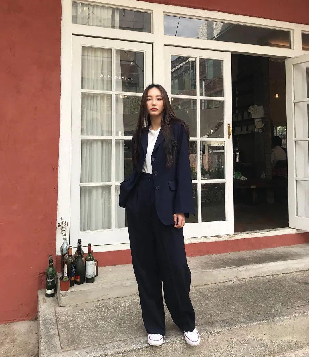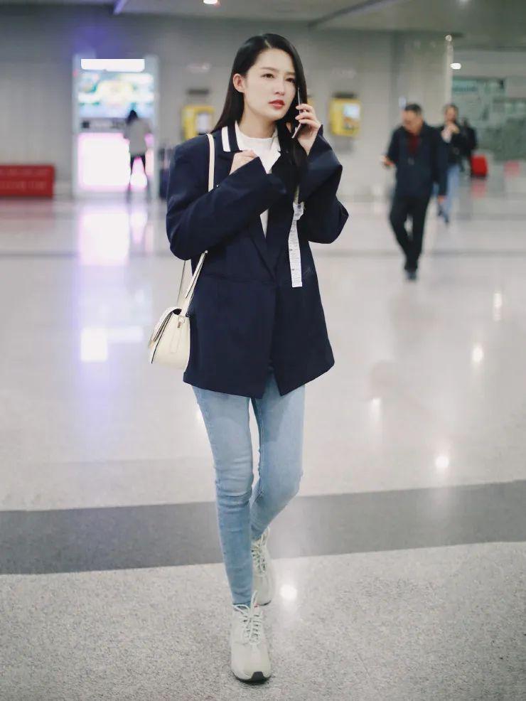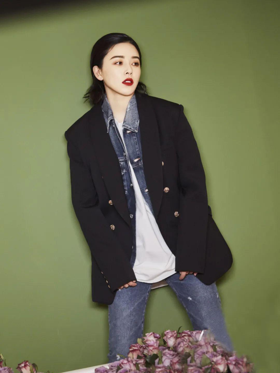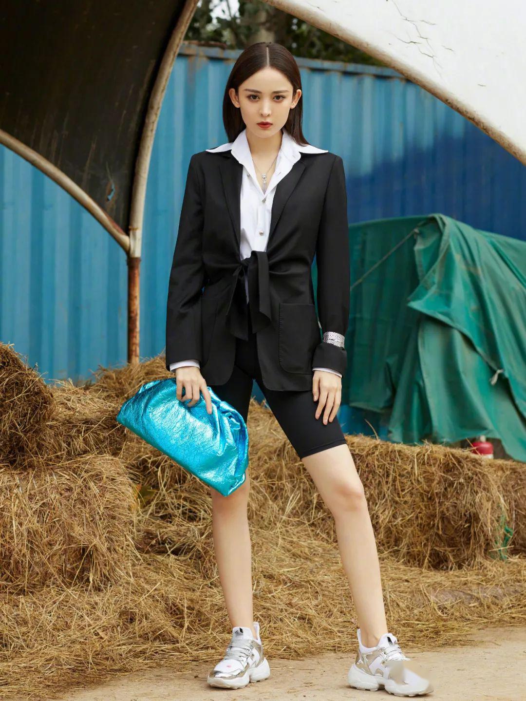 還有大冪冪用黑色西裝內搭藍色打底衫,小白鞋突顯運動感。