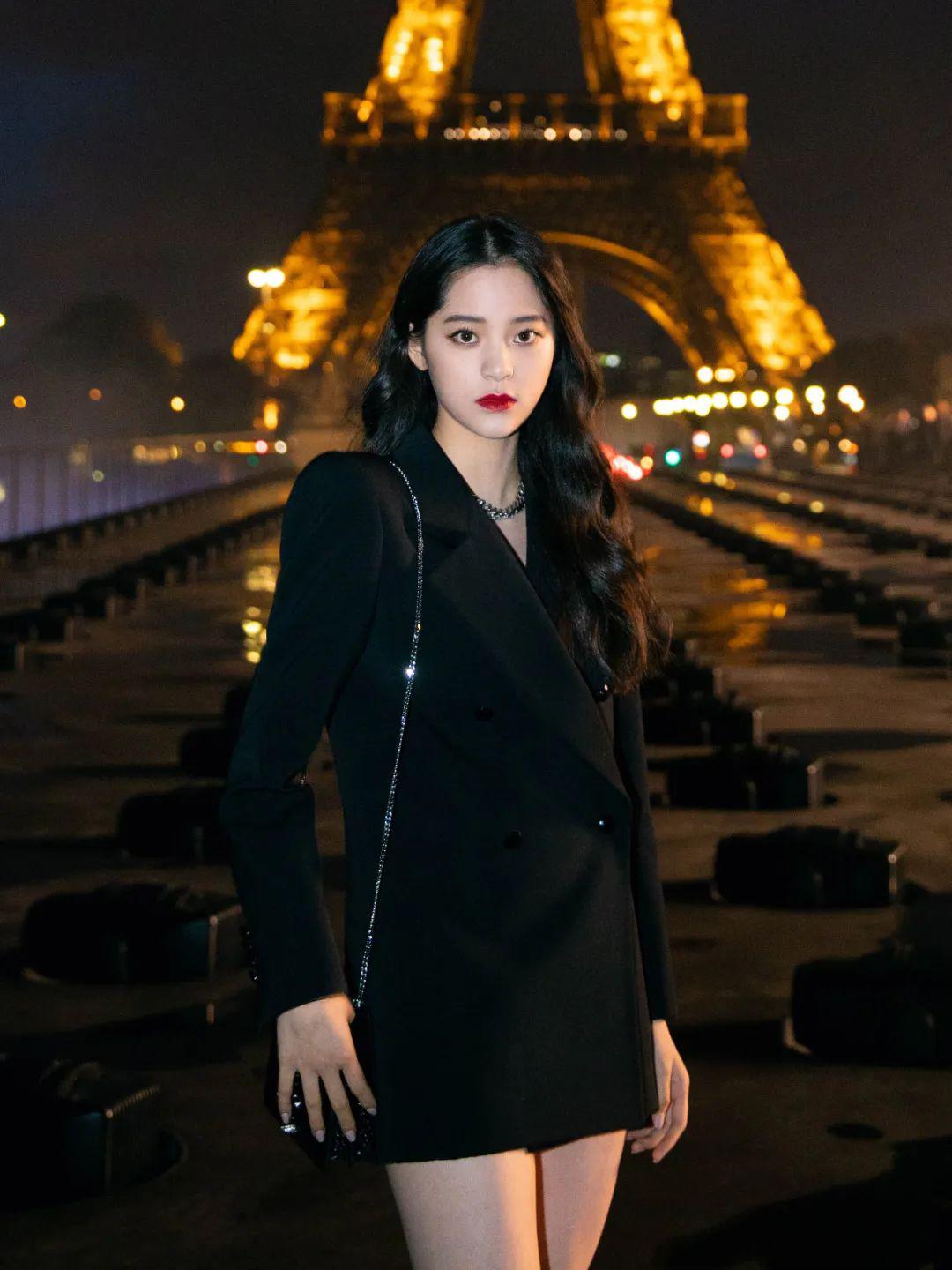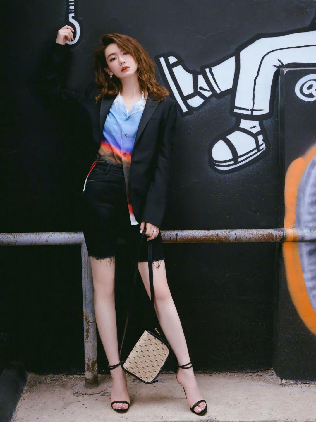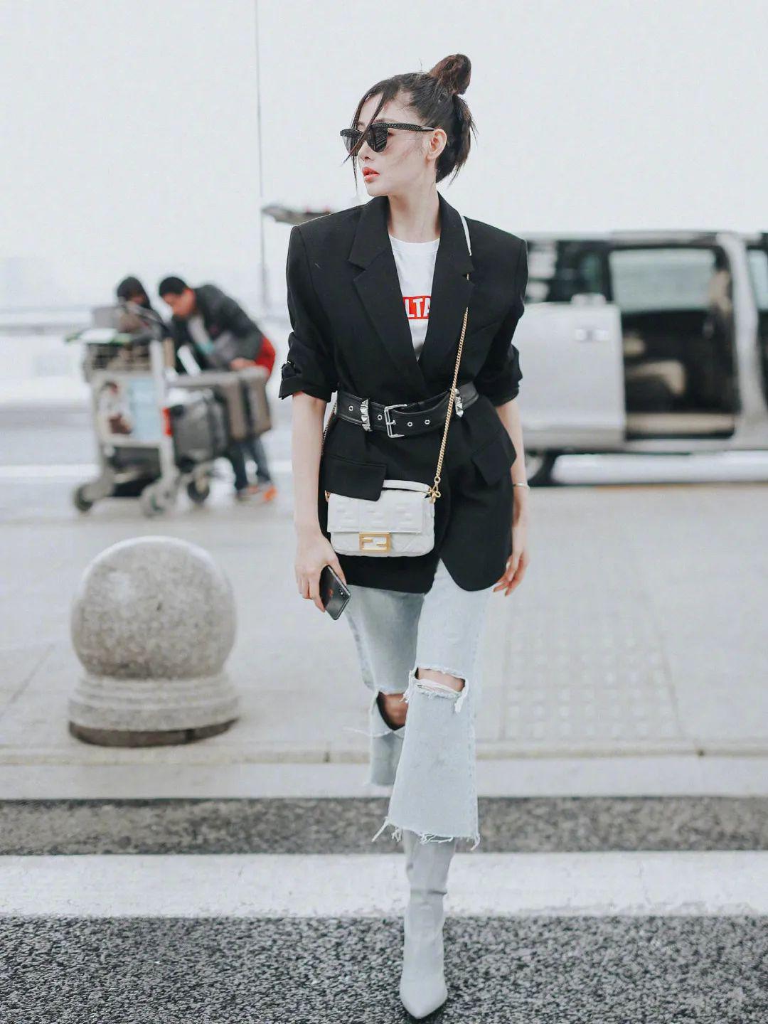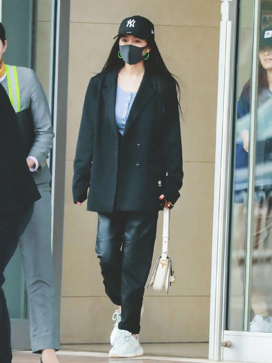 還有大冪冪用黑色西裝內搭藍色打底衫,小白鞋突顯運動感。