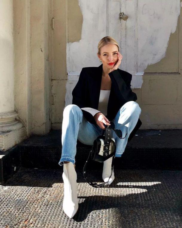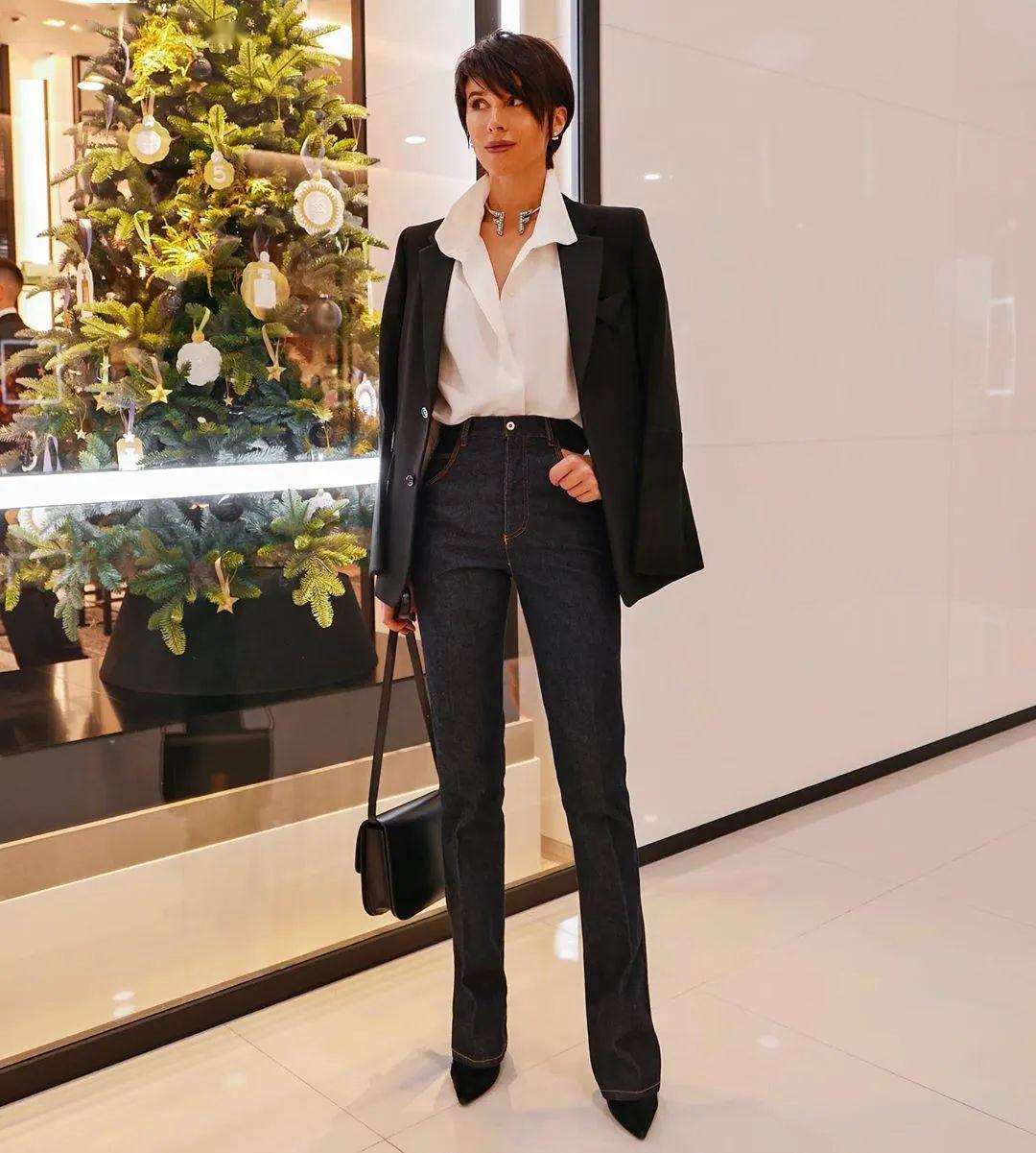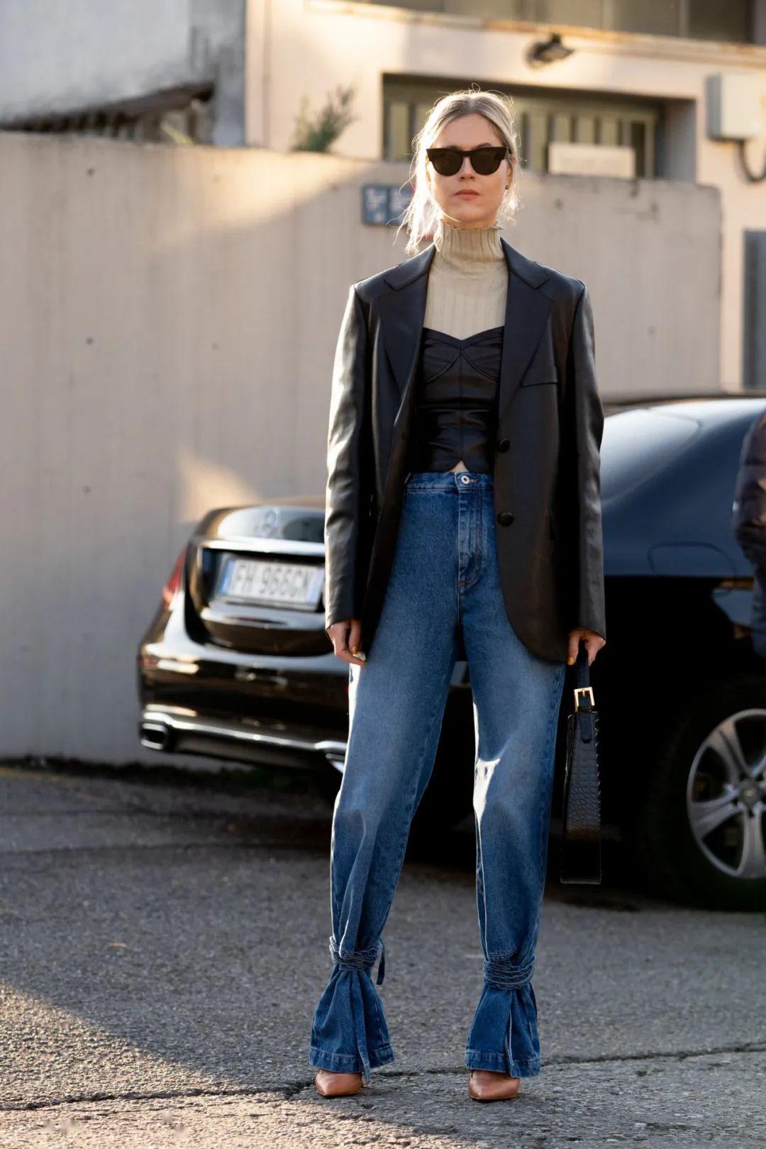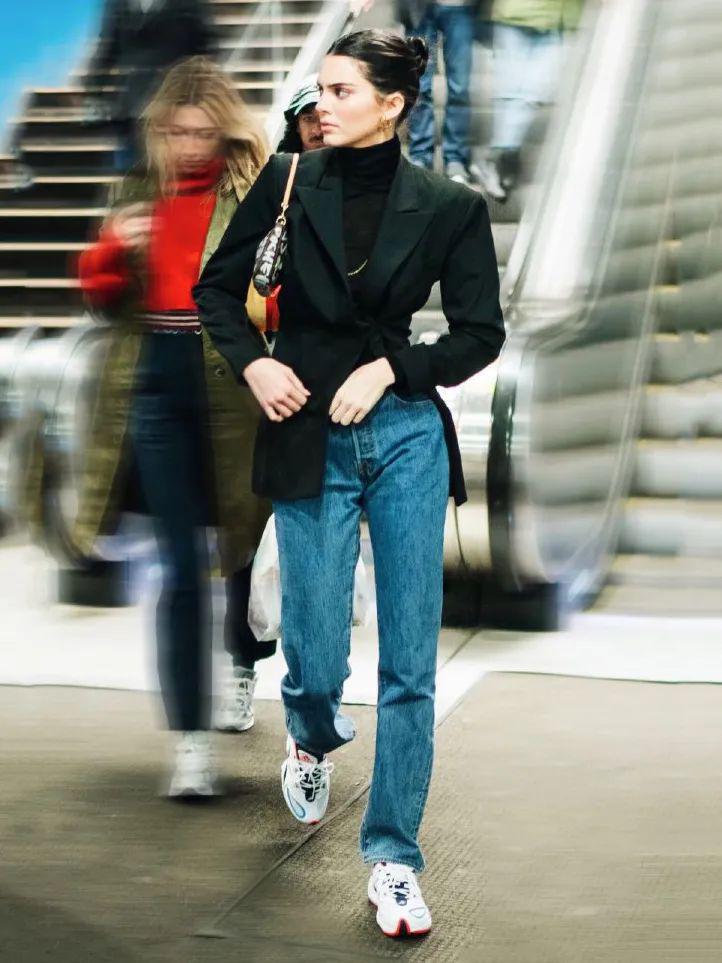 黑西裝比起其他顏色的西裝更顯嚴肅正經,想要它擺脫那份過于刻板感覺,那就配一條牛仔褲吧。