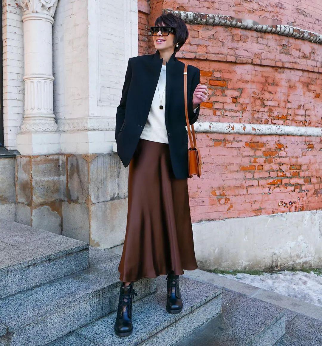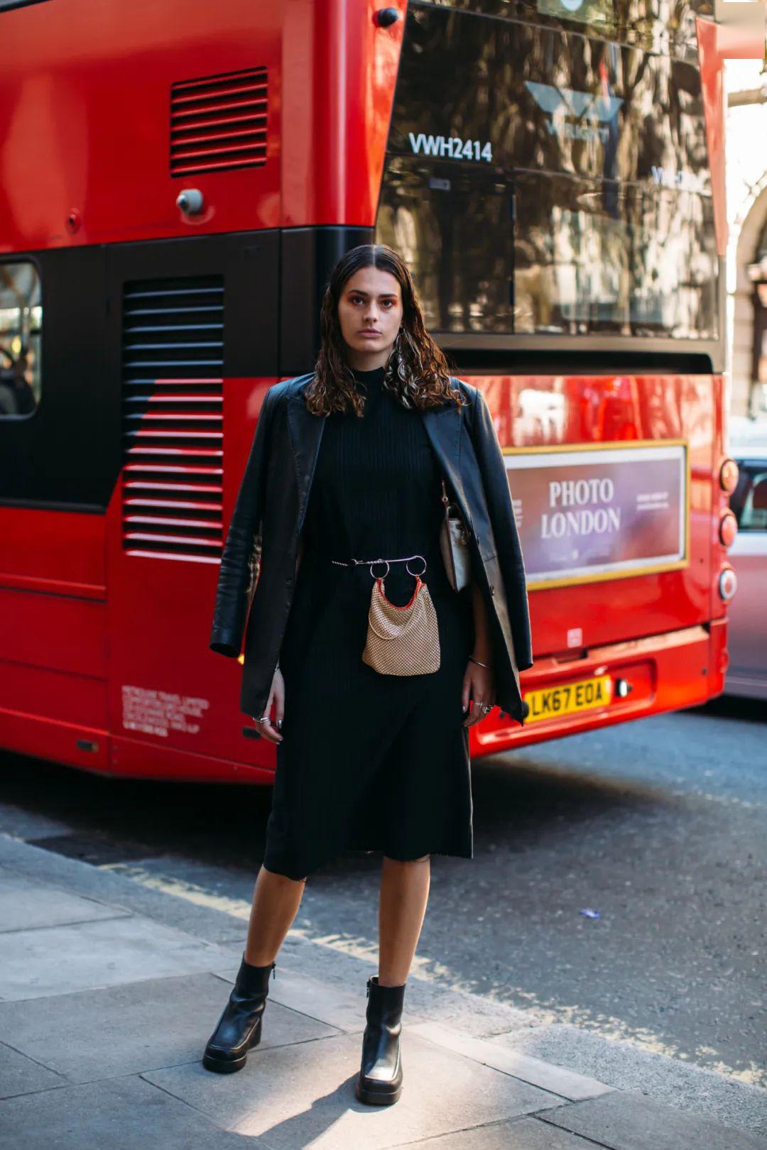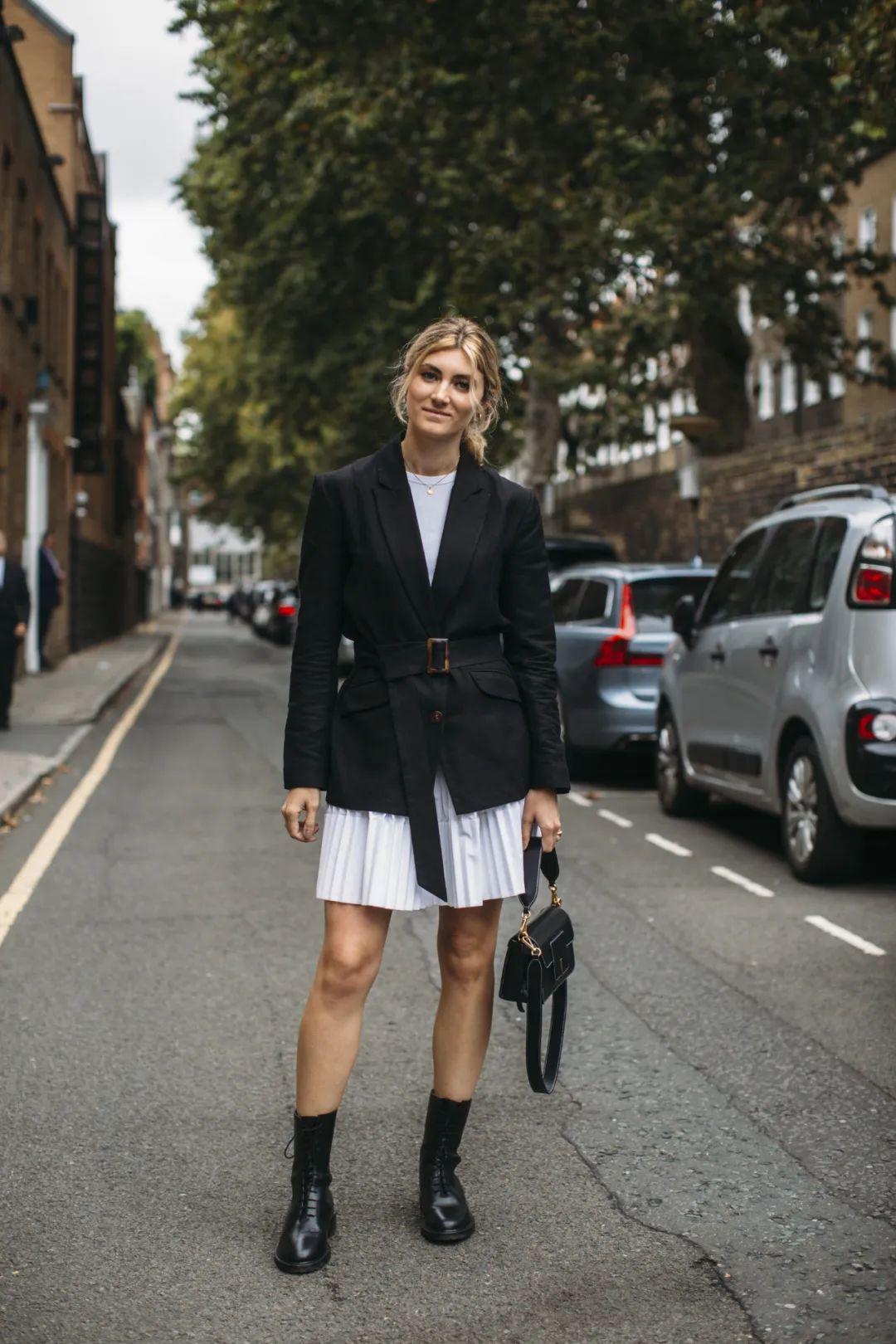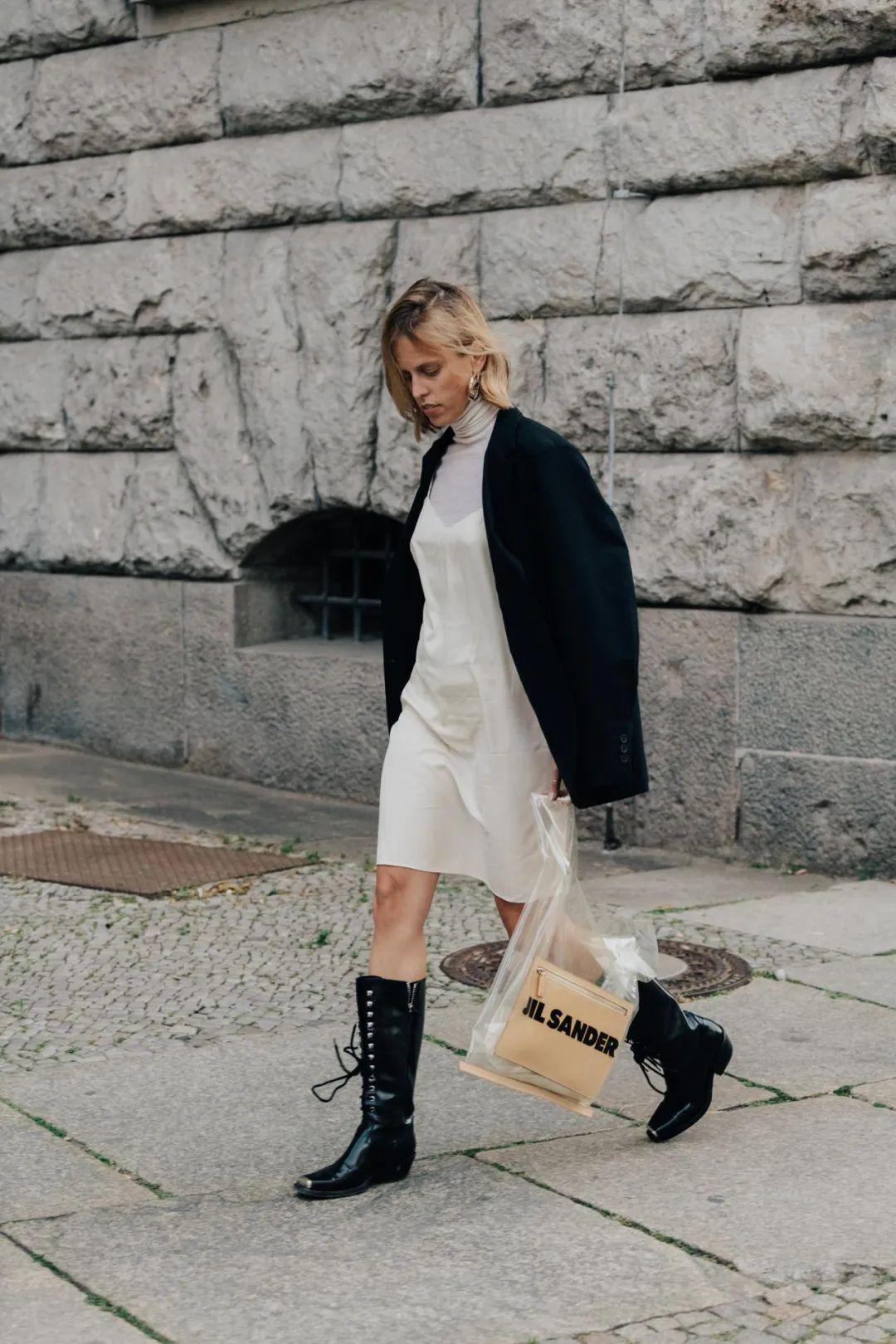 皮質小西裝+針織連衣裙,軟硬兼施,也可以豐富層次。