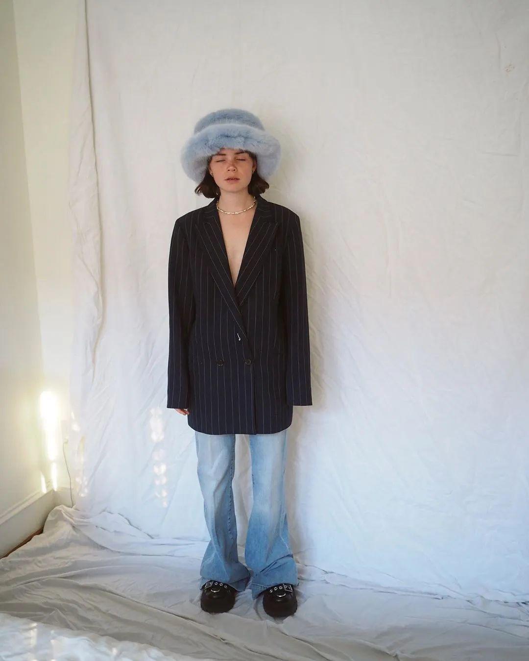 Reese Blutstein的穿衣風格自成一派,廓形條紋西裝搭配藍色牛仔褲,有一個小孩子偷穿大人衣服的既視感。