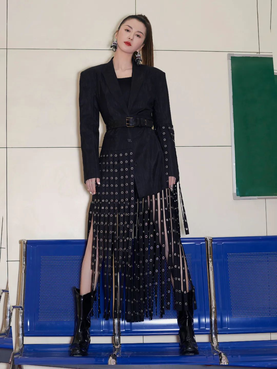 超模何穗則是用黑西裝+襯衫裙+長靴,超酷。