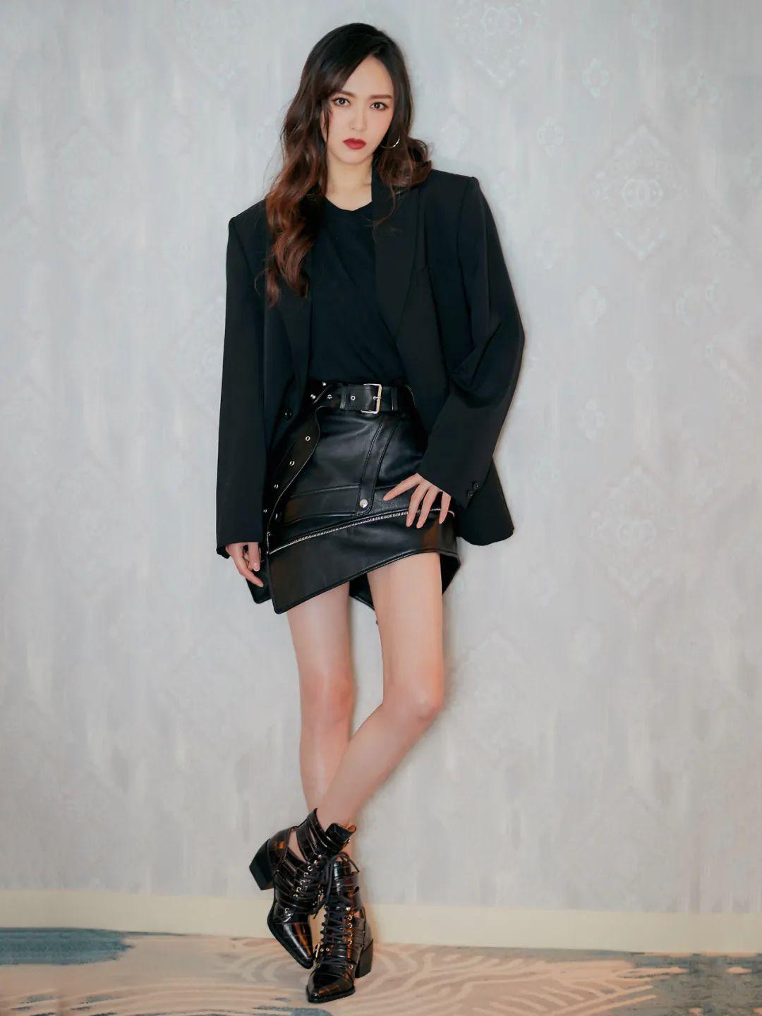 唐嫣就用黑色廓形西裝搭配A字型小皮裙,又颯又美。