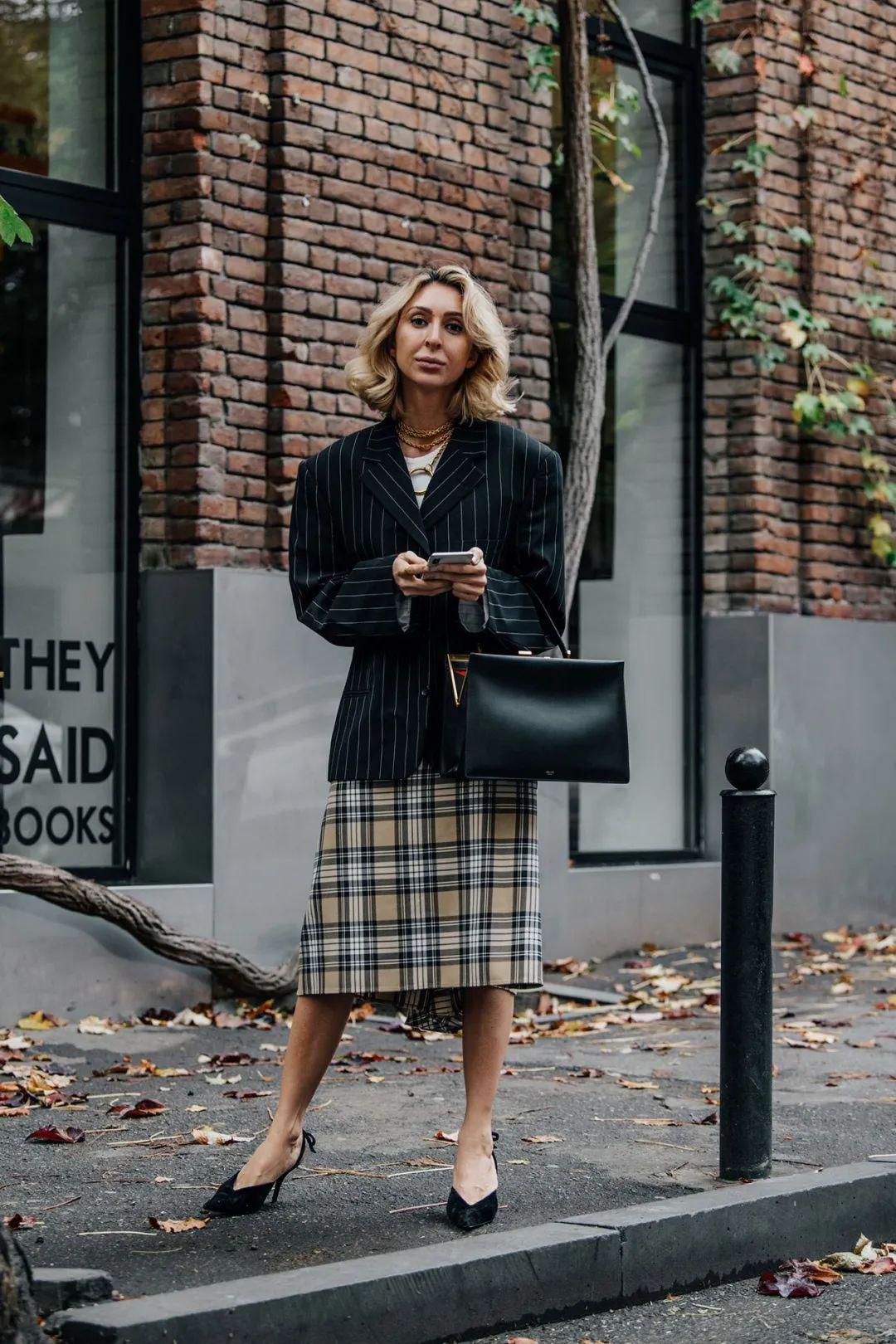 條紋西裝+格子半裙,配上金色配飾,更顯氣質。