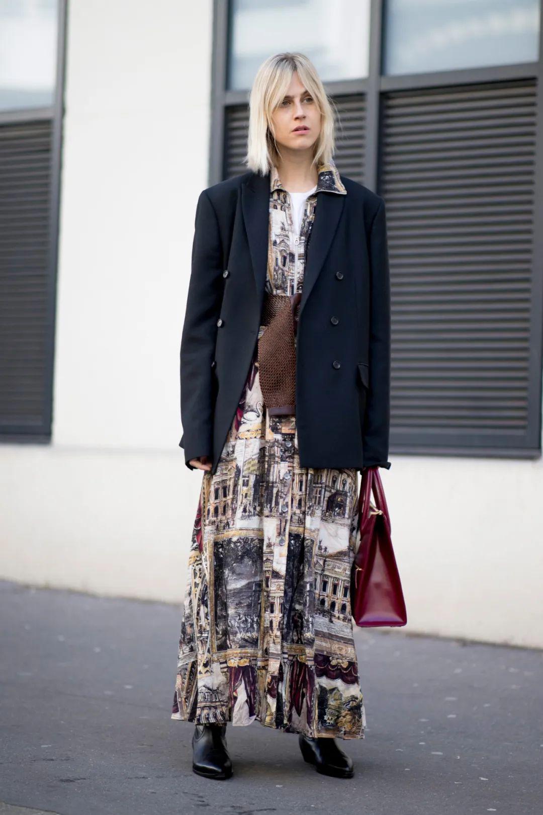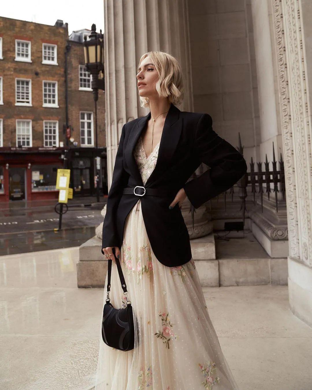 印花連衣裙搭配純色黑西裝,簡繁結合。
