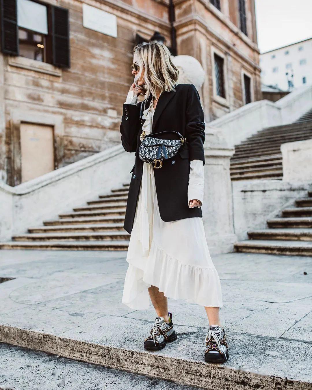 春夏穿上連衣裙美出圈,外搭黑色小西裝,上班或去一些正式的場合都可以這樣穿。