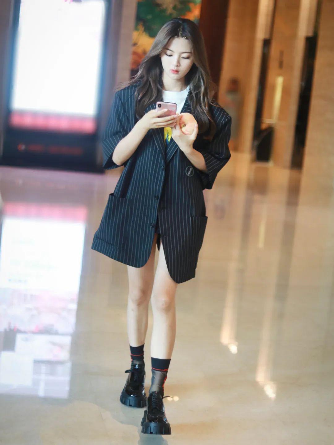 楊超越就是用廓形條紋西裝內搭白T,小姐妹們可以參考一下,露襪小心機刷起來哦。