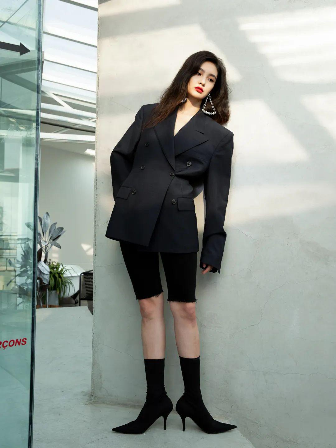 娜扎則是用黑西裝搭配黑色騎行褲,雙腿又細又長。