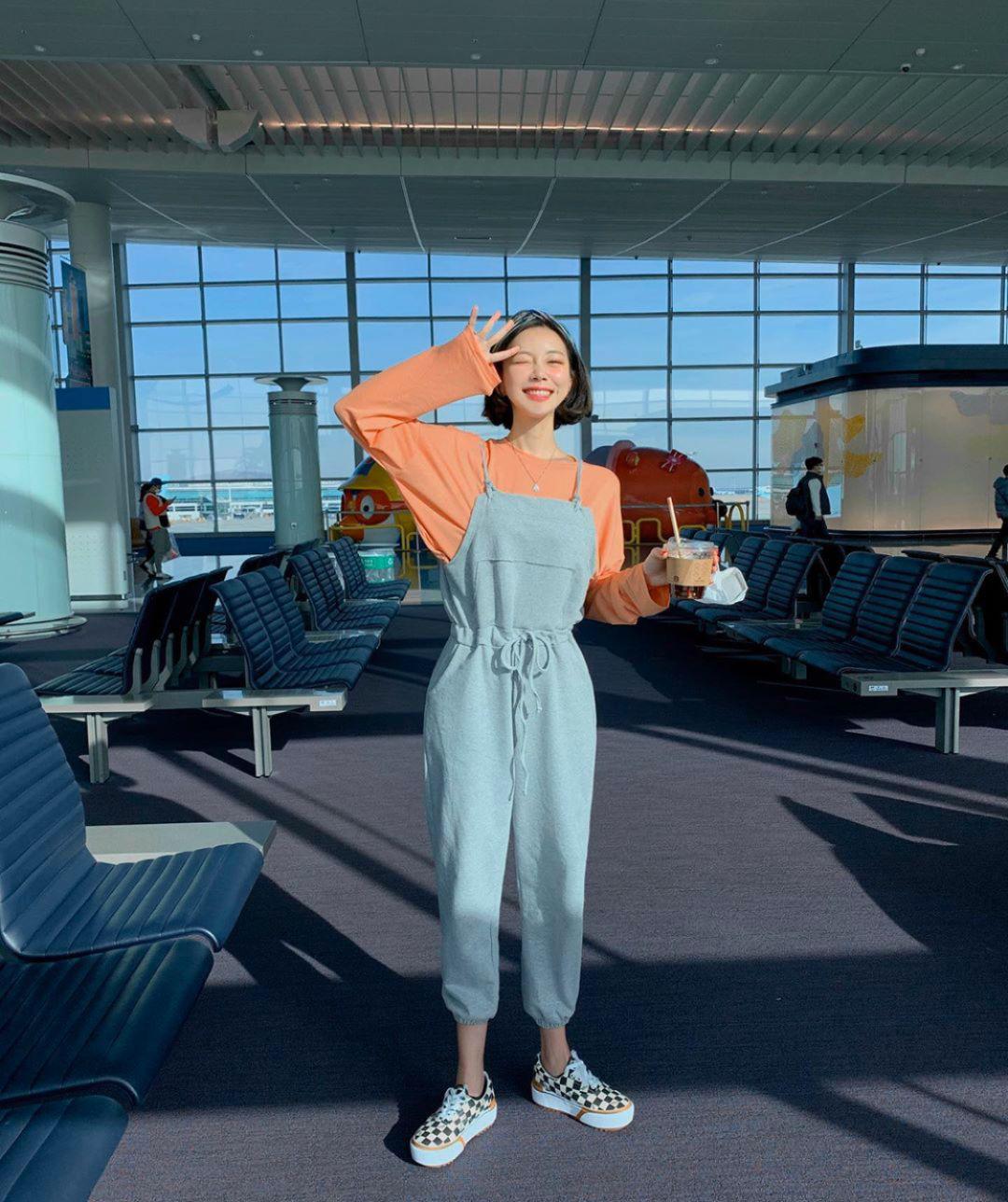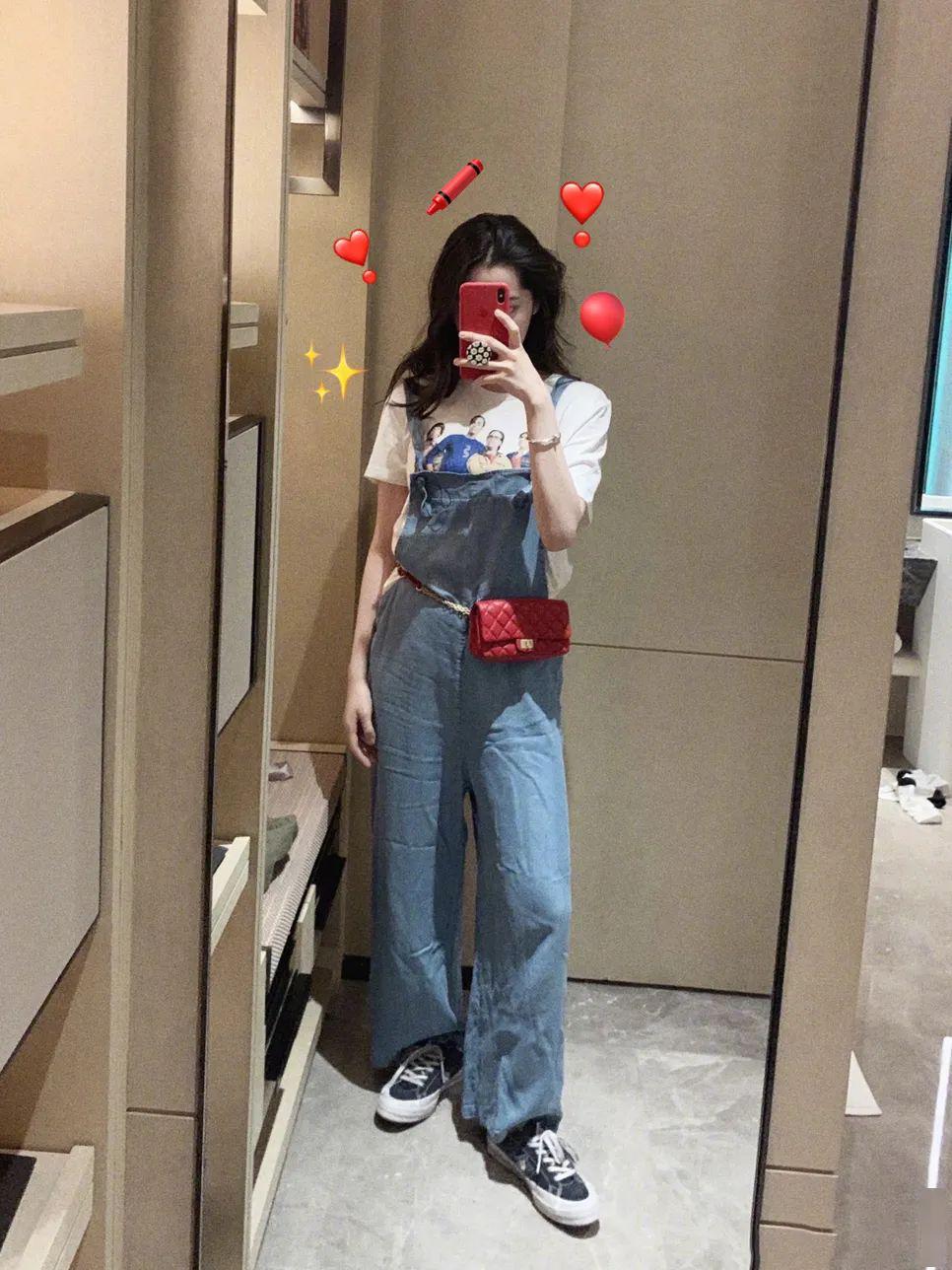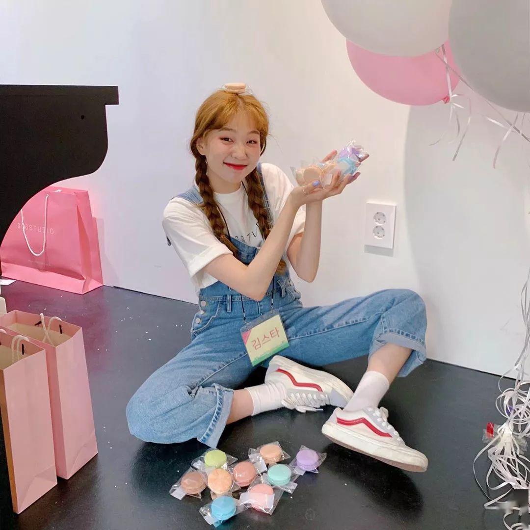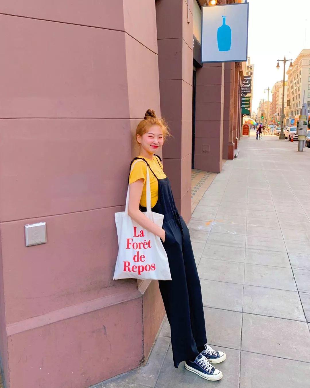 譚松韻選擇用藍色背帶褲搭配黑色衫,再配一雙白色運動鞋,瞬間便清爽了幾分。