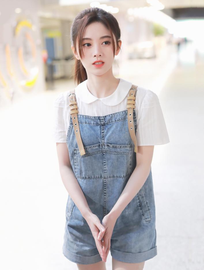 鞠婧祎則是用短款初戀褲搭配白色娃娃領套衫,太可愛了。