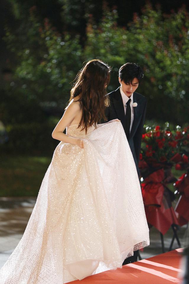 baby身穿一件隆重的抹胸金絲裙,長發披肩,皮膚白皙,宛如仙女下凡般美麗, baby因為裙子有些長,只能時時刻刻地用手提著,很是辛苦。今日份的baby看起了又瘦了好多,身材真是太好了,一旁的沙溢和坤坤好像是在和baby合影,可能今天的游戲是他們三人一組啦。