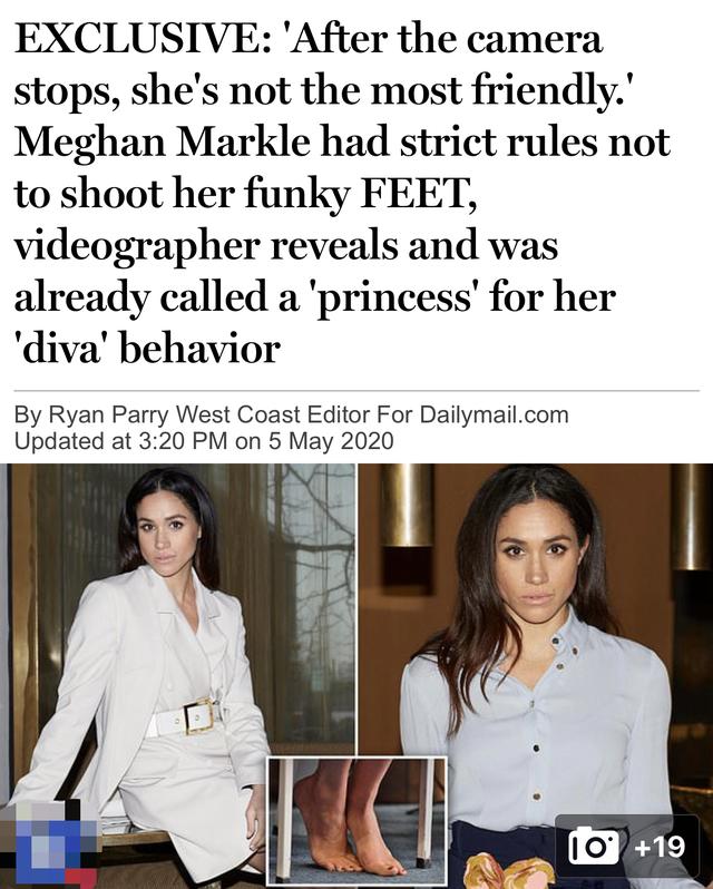 據攝影師爆料,梅根不管是進入王室前還是脫離王室后,每次出行不僅有一大票跟班,同時她在她制定的各種嚴苛規矩中有很奇葩的一項,就是要求攝影師們不能拍她的腳,尤其是光腳造型,出來的造型也要經過精修才能曝出。