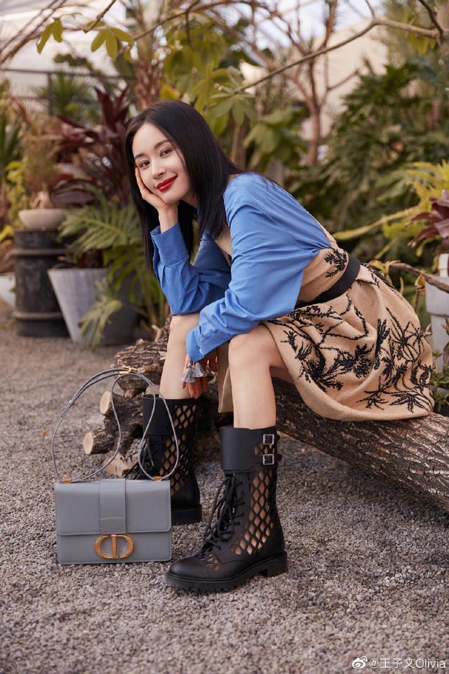 這種很難hold的住的藍色系她也敢拿來拼接,藍色拼接駝色系印花裙,撞色的感覺很是特別,腳踩一雙適合夏日的鏤空馬丁靴,帥氣又清涼。