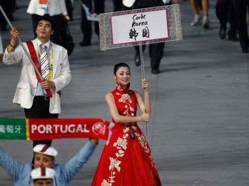 彼時,費費入選當上了2008年奧運會開幕式的引導員,在韓國隊在開幕式上出場時,費費以引導員的身份舉牌出現(有沒有人跟我一樣,莫名想到了《請回答1988》里引導馬達加斯加出場的德善)。一身紅色旗袍的費費,美貌驚人!