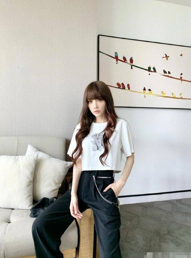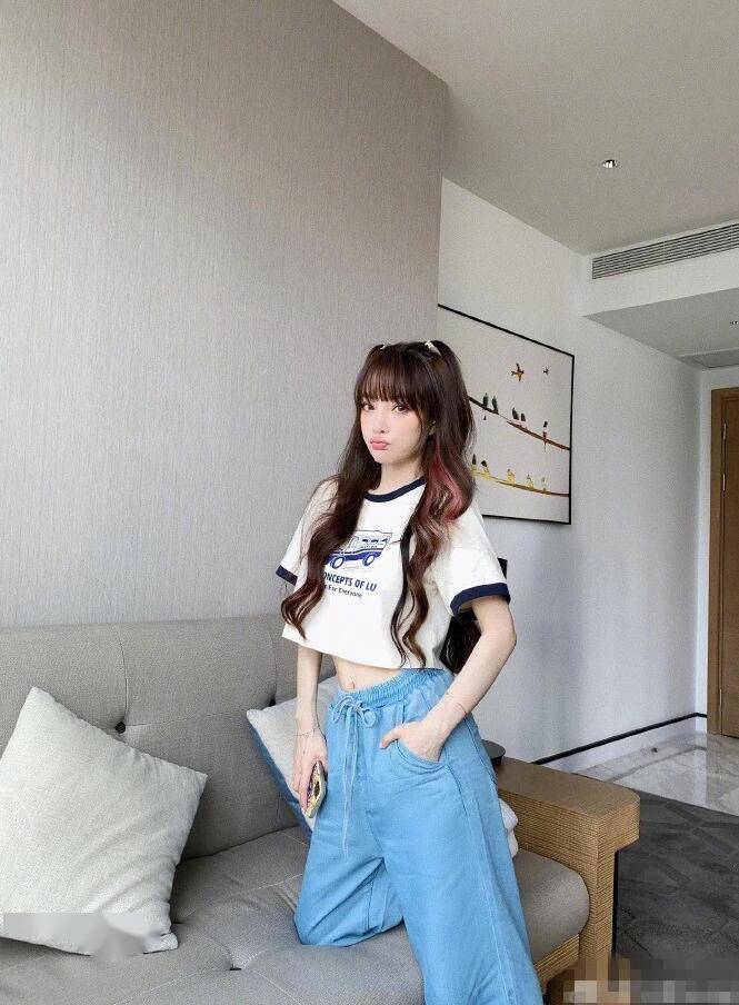 照片中,李小璐穿著一身露臍裝,高過腰線的闊腿褲把她本來偏矮的身高顯出了一米八的氣勢。