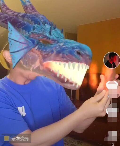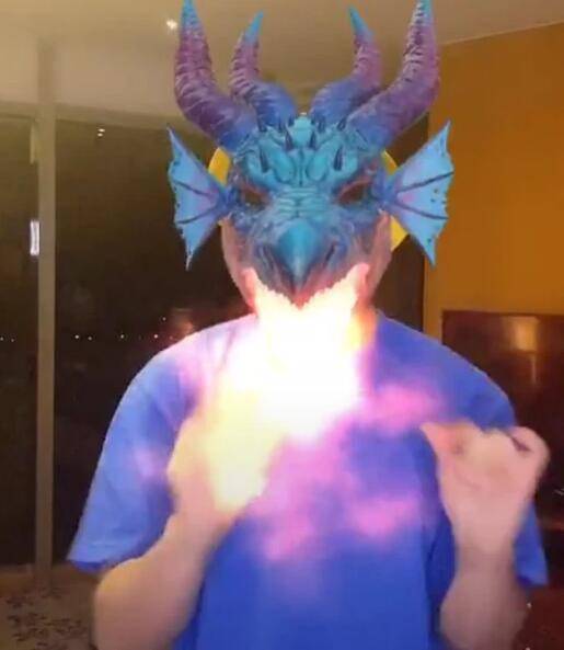 視頻中,賈乃亮穿著一身藍色T恤,一會兒戴帽子一會兒張開嘴化身“噴火龍”。