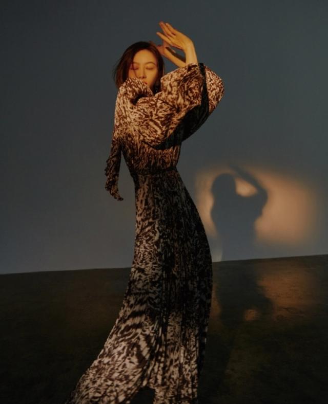 宋茜的另一張照片是身穿一件動物紋的連衣裙,夸張的蓬蓬袖設計,有種復古的味道,也讓這些造型看起來更加有時尚的感覺,宋茜站在陽光之下,對著鏡頭做出拍照的姿勢,光影之間有此不一樣的時尚味道。