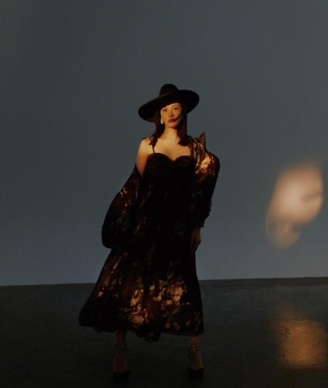 宋茜身穿著細帶的黑色吊帶上衣下半身搭配華麗的裹身半裙,展露出了她凹凸有致的好身材,頭上戴著一點寬帽檐的禮服帽,又營造出不一樣的時尚感,在關于以交錯的鏡頭之中,展露出她獨特的表現力。